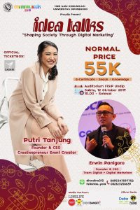 Idea Talks 2019 a national seminar organized by the Student Association of Communication Sciences Department, University of Diponegoro. This event is one of a series of events COMMWEEK event. Held on October 12, 2019 in the Auditorium of Faculty of Social UNDIP, IdeaTalks this year carries the theme ‘SHAPING SOCIETY THROUGH DIGITAL MARKETING’ expected that the younger generations can cultivate and develop creativity in the digital age of marketing so that it can be adapted to the society behavior-pattern.