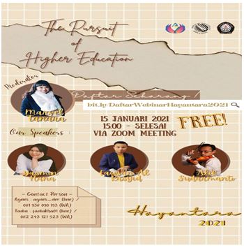 Semarang – Rookie Diponegoro University Communication Science HMD successfully held a webinar entitled Hayantara 2021 on Friday (15/1). With the theme “The Pursuit of Higher Education” this event aims to explain effective learning strategies to face the SBMPTN, tips for choosing a major, and also motivation for State University (PTN) fighters to consistently maintain hope during a pandemic.