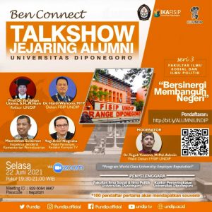 Poster of Alumni Networking Talkshow Universitas Diponegoro Batch 3 Faculty of Social and Political Sciences: “Synergizing in Building the Nation”. (Pict: Instagram @undip.official) Semarang –