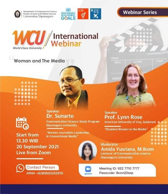 Semarang—Department of Communication Sciences held an international webinar on Monday (20/9) at 13.30 WIB through the Zoom Meeting platform which was attended by 184 participants. This webinar raised the topic of Woman and The Media, which was presented by two speakers with academic backgrounds: Dr. Sunarto, a lecturer in Communication Science at Diponegoro University (Undip) and Prof. Lynn Rose, lecturer in Humanities at the American University of Iraq Sulaymani (AUIS). This webinar was guided by Undip’s Communication Science lecturer, Amida Yusriana, M.Ikom as moderator.