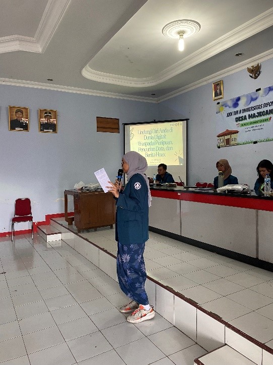 On Saturday, August 3, 2024, Hutari Indah Nuranti, a student from Team II of Universitas Diponegoro’s Community Service Program (KKN), organized an important campaign themed “Anti-Hoax and Data Theft” at the Majegan Village Hall. This campaign aimed to educate the villagers on the importance of discerning the information circulating on social media and raising awareness of online fraud.