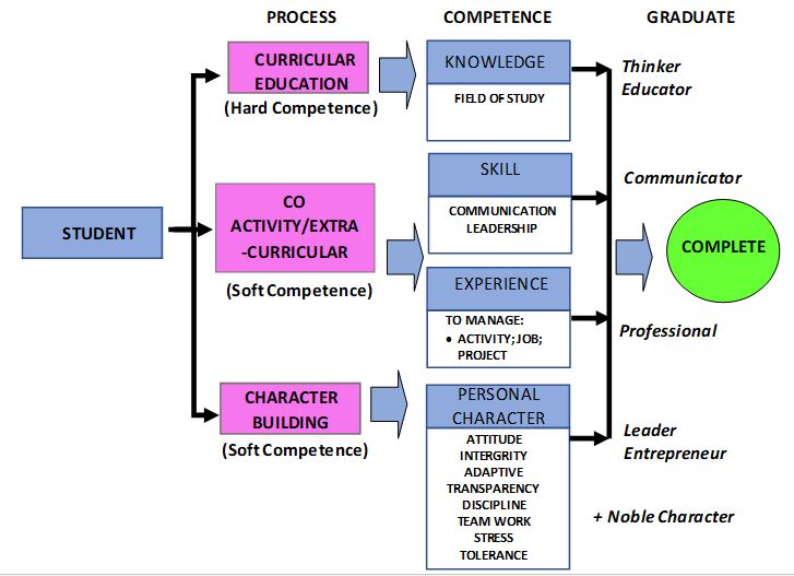 The creation of graduates with noble character and academic ability, and / or superior professionals, characterized by COMPLETE, namely as a Communicator (able to communicate), Professional (experts and upholding the code of ethics), Leader (having the spirit of leadership), Entrepreneur (having the entrepreneurial spirit, independent and high work ethic), Thinker (thinker, critical and creative), and Educator (as an agent of change).