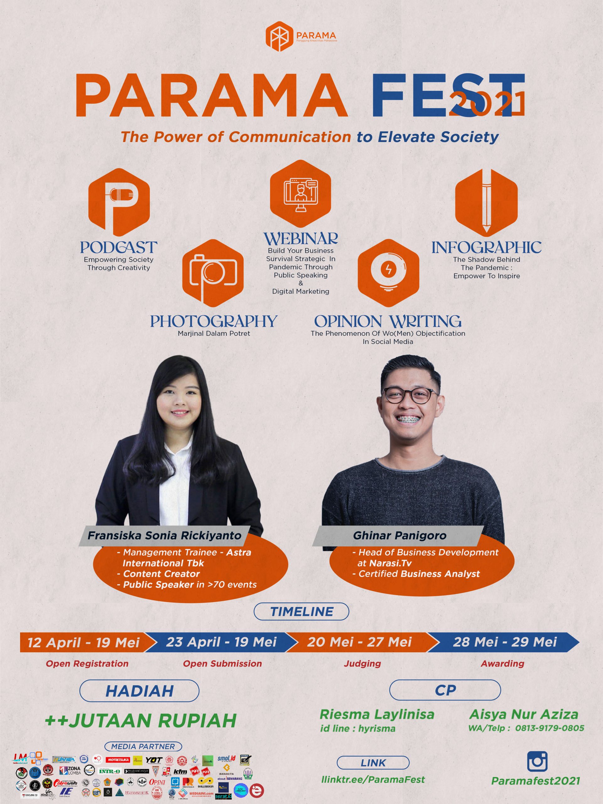 Setelah gunting pita pada 12 April 2021 silam, Parama Fest kini memasuki babak pengumpulan karya kompetisi Penulisan Opini, Fotografi, Desain Infografis, serta Podcast dan pendaftaran Webinar sampai 19 Mei 2021 mendatang, sepuluh hari sebelum puncak acara pada 29 Mei 2021 dengan penyelenggaraan Webinar serta pemberian penghargaan kepada pemenang lomba.