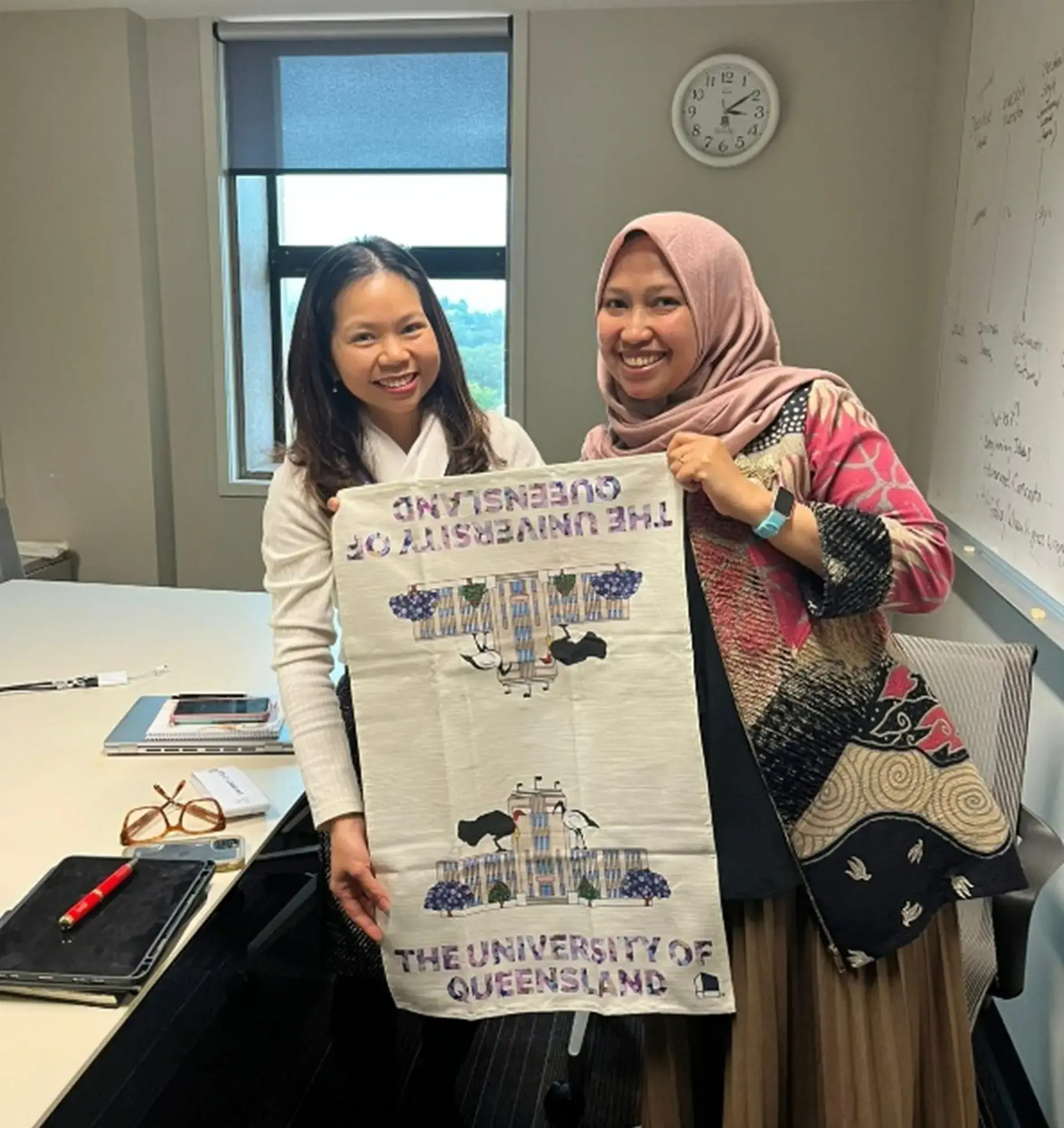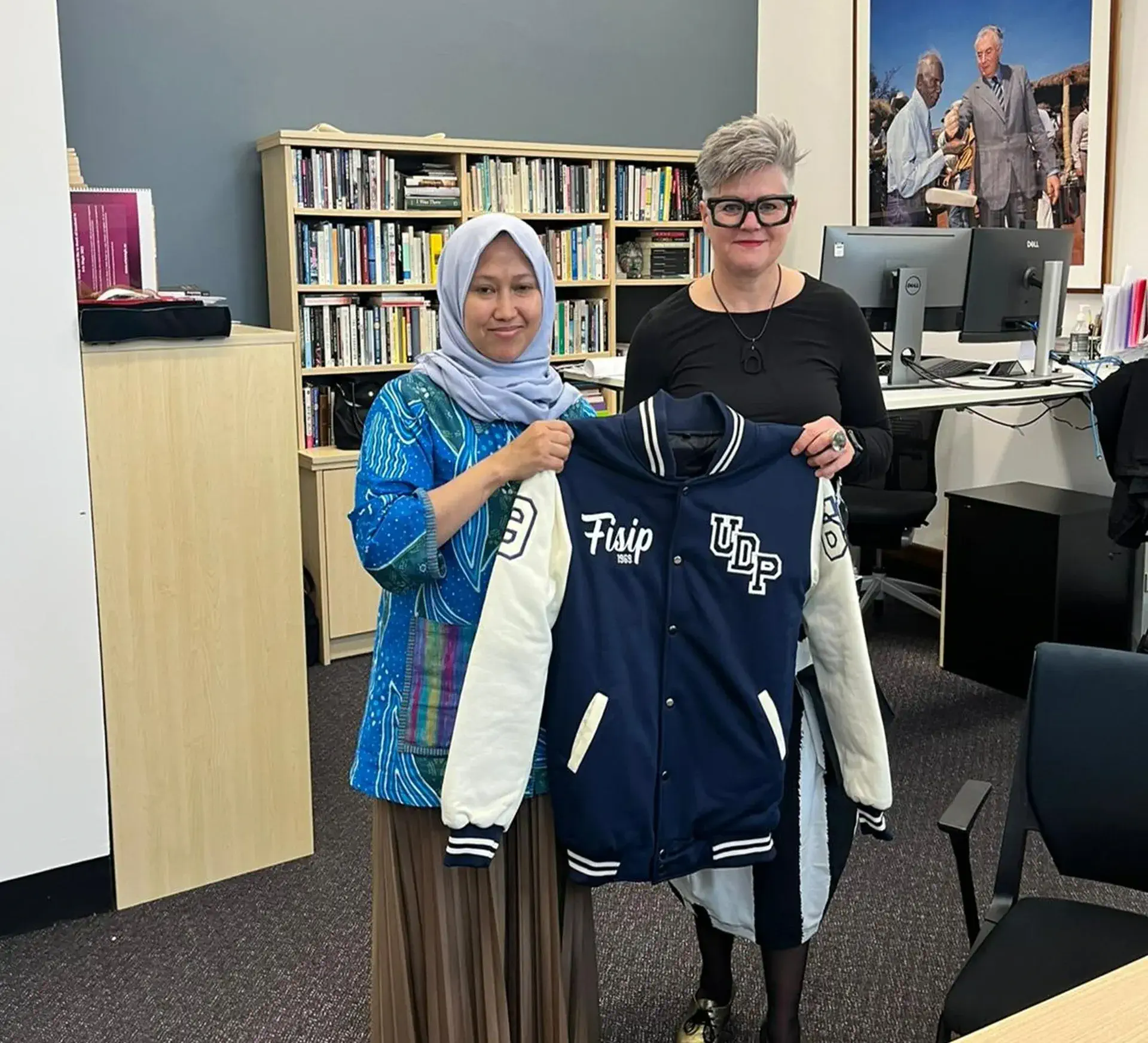 Dalam rangkaian kunjungan, delegasi Ilmu Komunikasi FISIP Undip disambut langsung oleh Professor Heather Zwicker, Executive Dean HASS UQ. Pertemuan ditandai dengan penyerahan gift set dari Dekan FISIP Undip, termasuk jaket oranye khas FISIP yang langsung dikenakan oleh Prof. Zwicker. Sebagai balasan, pihak UQ juga memberikan cinderamata resmi untuk Dekan FISIP Undip sebagai simbol persahabatan akademik.